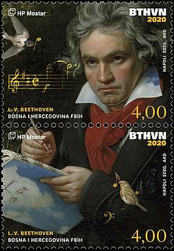 Bosnia-Hertsegovinassa ilmestyy kolmenlaisia postimerkkejä, joista yksiä julkaisee Croatian Post Mostar. Se julkaisi Ludwig van Beethovenin 250-vuotissyntymäpäivän johdosta joulukuussa kahden postimerkin sarjan. Tämä on valittu vuoden 2020 kauneimmaksi musiikkiaiheiseksi postimerkkijulkaisuksi kansainvälisen Motivgruppe Musik -postimerkkiyhdistyksen järjestämässä äänestyksessä. Toiseksi tuli Itävallan kontrabassoaiheinen merkki. Beethoven on postimerkillä ensimmäisen kerran Itävallassa vuonna 1922. #90