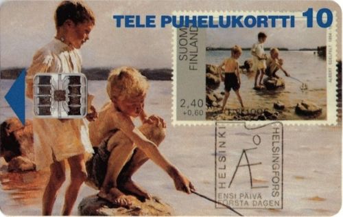 Puhelukortin kääntöpuolella on Suomen Filatelistiliiton mainos, jossa todetaan muun muassa: ”Minustako postimerkkeilijä? Miksikäs ei? Kaikkihan me keräämme jotain”. Keräilyn voisi aloittaa vaikkapa Albert Edelfeltin teoksia esittävistä postimerkeistä. Niitä on julkaistu myös ulkomailla. #95