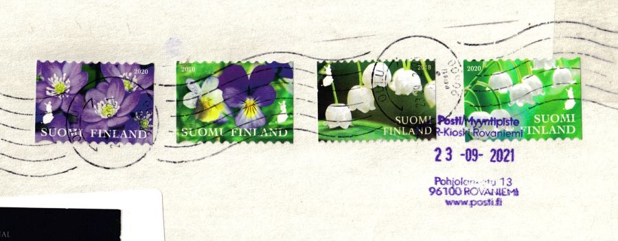 Lähettäjä on vienyt kirjeen Rovaniemellä Postin palvelupisteeseen ja pyytänyt sille filateelista leimaa. R-kioskin myyjä kertoi, että pyöröleima on mennyt rikki ja kysyi, kävisikö kuvan violetti leima. Lähettäjä myös näki leimasimen ja leimaamisen.
