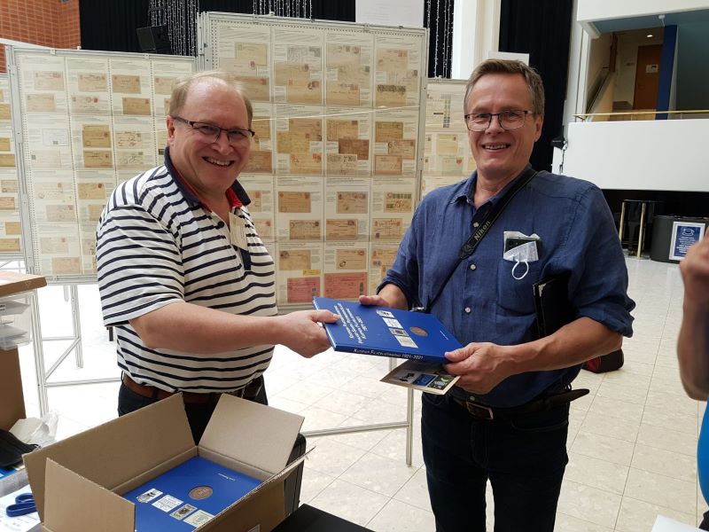 Mikael Collan kertoo näyttelystä ja sen kokoelmista malli1930.fi-blogissaan. Alla olevassa kuvassa blogista Kuopion Filatelistikerhon ja näyttelytoimikunnan puheenjohtaja Risto Pitkänen sekä 100-vuotishistoriikin kirjoittaja Lauri Poropudas tutkivat valmista kirjaa. #88