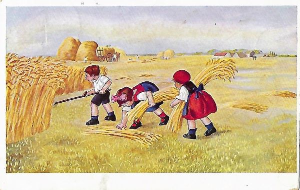 Toinen kortti, joka on melkein samanlainen, ei olekaan ihan samanlainen. Sen tausta kylläkin, mutta etualalla ovatkin lapset korjaamassa viljaa. Kortin syntymäpäiväonnittelut on postitettu Värtsilässä 11.3.1927 ja kortti on leimattu saapuneeksi Haminassa seuraavana päivänä. Kortin tekijän signeerausta tai nimeä ei kortista löydy.