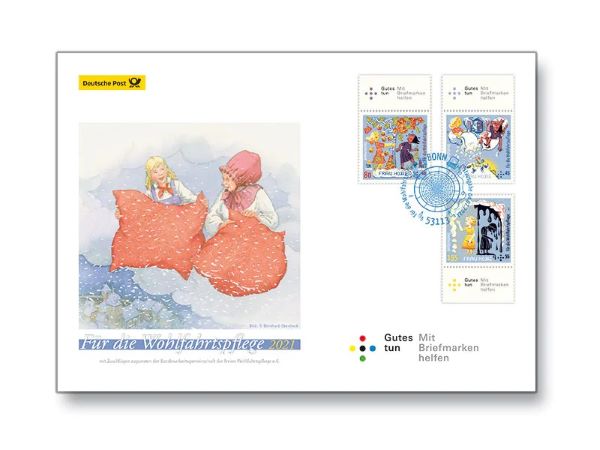 Deutsche Briefmarken-Zeitung (DBZ) kirjoittaa, että Saksan posti Deutsche Post siirtyy käyttämään sinistä leimasinväriä. Kuvassa on 4.2. ilmestyneen, Grimmin Holle-muori-satua esittävän hyväntekeväisyyssarjan ensipäivänkuori postin verkkokaupan sivuilta. Asiasta kerrottiin Suomen Filatelistiseuran etäkokouksessa.