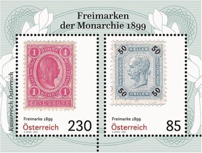 Itävallassa ilmestyi uuden valuutan mukainen, helleri- ja kruunuarvoisten postimerkkien sarja joulukuussa 1899. Itävallan posti on julkaissut 6.3. pienoisarkin, jossa on kaksi arvoa tuosta sarjasta. Sekapostitteita kreutseri- ja guldeniarvoisten merkkien kanssa esiintyy. Kuva on postin sivuilta.