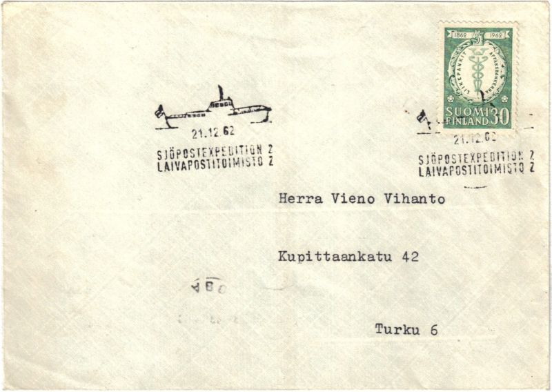 Kirjeellä on laivapostitoimisto 2:n leima 21.12.1962 ja Turun tuloleima seuraavalta päivältä. Laivapostileiman myöhäisin havainto on Johan Snellmanin tutkimuksen mukaan 23.12.1976. Toimipaikka oli Turun postikonttorin alainen. 1970-luvun termein moottorivene Pietari Brahe olisi ollut postipalveluvene.