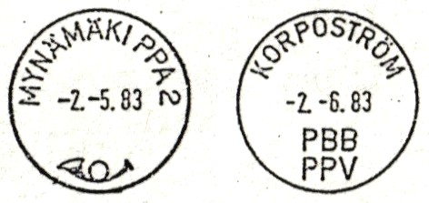 Postipalvelulinjoilla käytettiin yleensä tavanomaisia postitorvimallisia lähtötoimipaikan leimoja. Timo ja Tapani Fagerin luettelossa on 13 leimaa, joissa lukee paikkakunnan lisäksi PPA ja Korpoströmin leimassa PBB PPV. Heinäkuulle 1983 päivätyllä Posti- ja telehallituksen postiliikenneosaston määräyksellä PPA-leimasimista oli välittömästi luovuttava. Korpoströmin leimaa esiintyy kuitenkin vielä ainakin vuoden 1985 kesäkuussa.